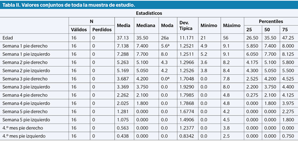 Se realizó la prueba de normalidad de las variables cuantitativas para el contraste de hipótesis para saber si debemos aplicar el test paramétrico o no paramétrico. En este estudio, como la muestra era inferior a 50 sujetos, para la prueba de normalidad nos fijamos en la prueba de Shapiro-Wilk y desechamos la prueba de Kolmogorov-Smirnov, donde podemos observar que no todas las variables tienen distribución normal, ya que el p valor de la prueba de normalidad no fue significativo (p > 0.05). Solo resultó significativa en las primeras semanas del estudio (Tabla I). Las variables de la edad, así como la semana 1.ª, 2.ª y 3.ª, tanto en el pie izquierdo como en el derecho, estaban dentro de la normalidad (p > 0.05). Sin embargo, las variables de la semana 4.ª-5.ª y la revisión de los cuatro meses de ambos pies no se obtuvieron distribución normal (p < 0.05) (Tabla I).