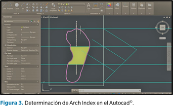 El análisis morfológico y la clasificación de la huella plantar se realizaron hallando el Arch Index (AI). Se obtuvieron las huellas plantares con un pedígrafo manual de tinta y posteriormente fueron digitalizadas con una fotocopiadora multifunción automática, en escala 1:1, a color 200 dp y resolución 200 dpi. Las imágenes digitalizadas se importaban al programa Autocad© 2017 para Windows (Autodesk Inc., California, EE. UU.), sobre el cual se realizaron las mediciones de áreas y se clasificó la morfología de las huellas siguiendo la metodología y valores de referencia definidos por Cavanagh y Rogers21 (Figura 3).