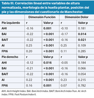El análisis de correlación lineal (Tabla III) muestra que ninguna de las variables que definen la morfología, altura o posición del ALI mostró una correlación lineal relevante con las puntuaciones obtenidas en las dimensiones de Función del cuestionario de Manchester.