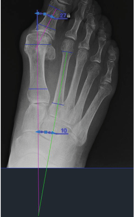 b) Mediciones radiográficas: Estas medidas son las realizadas en las radiografías dorsoplantares en carga prequirúrgicas y postquirúrgicas a los 6 meses.
