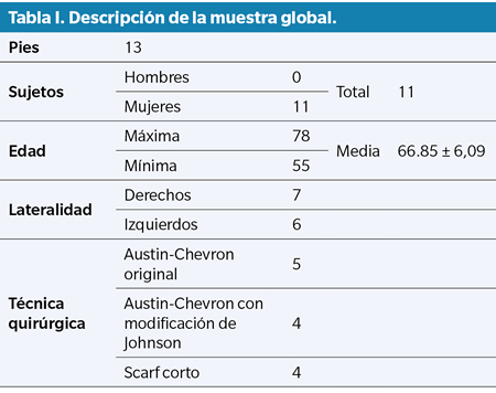 La muestra para este estudio (Tabla I) se compone de 13 pies, de los cuales 7 son derechos y 6 izquierdos, pertenecientes a 11 sujetos. Todos ellos son mujeres de edades comprendidas entre los 55 y los 78 años (media 66.85 ± 6.09 años). Se realizaron un total de 13 procedimientos quirúrgicos para la corrección de la deformidad HAV, mediante 3 tipos de técnicas de osteotomía distintas: 5 con la osteotomía de Austin-Chevron original (38.5 %), 4 con la osteotomía de Austin-Chevron con modificación de Johnson (30.8 %) y 4 con la osteotomía de Scarf corto (30.8 %).