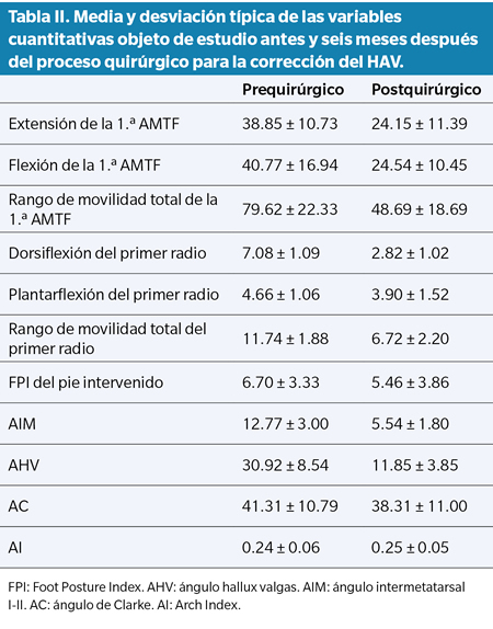 Resultados: El rango total de movilidad del primer radio pasó de 11.74 ± 1.88 mm a 6.72 ± 2.20 mm; y el de la primera articulación metatarsofalángica pasó de 79.62° ± 22.33° a 48.69° ± 18.69° tras la cirugía. Los ángulos radiográficos de hallux valgus y ángulo intermetatarsal disminuyeron una media de 19.07° ± 8.20° y 7.23° ± 2.97°, respectivamente. El ángulo de Clarke cambió de 41.31° ± 10.79° a 38.31° ± 11.00°. El “Arch Index” cambió de 0.24 ± 0.06 a 0.25 ± 0.05. Y el “Foot Posture Index” pasó de 6.70 ± 3.33 de media antes de
