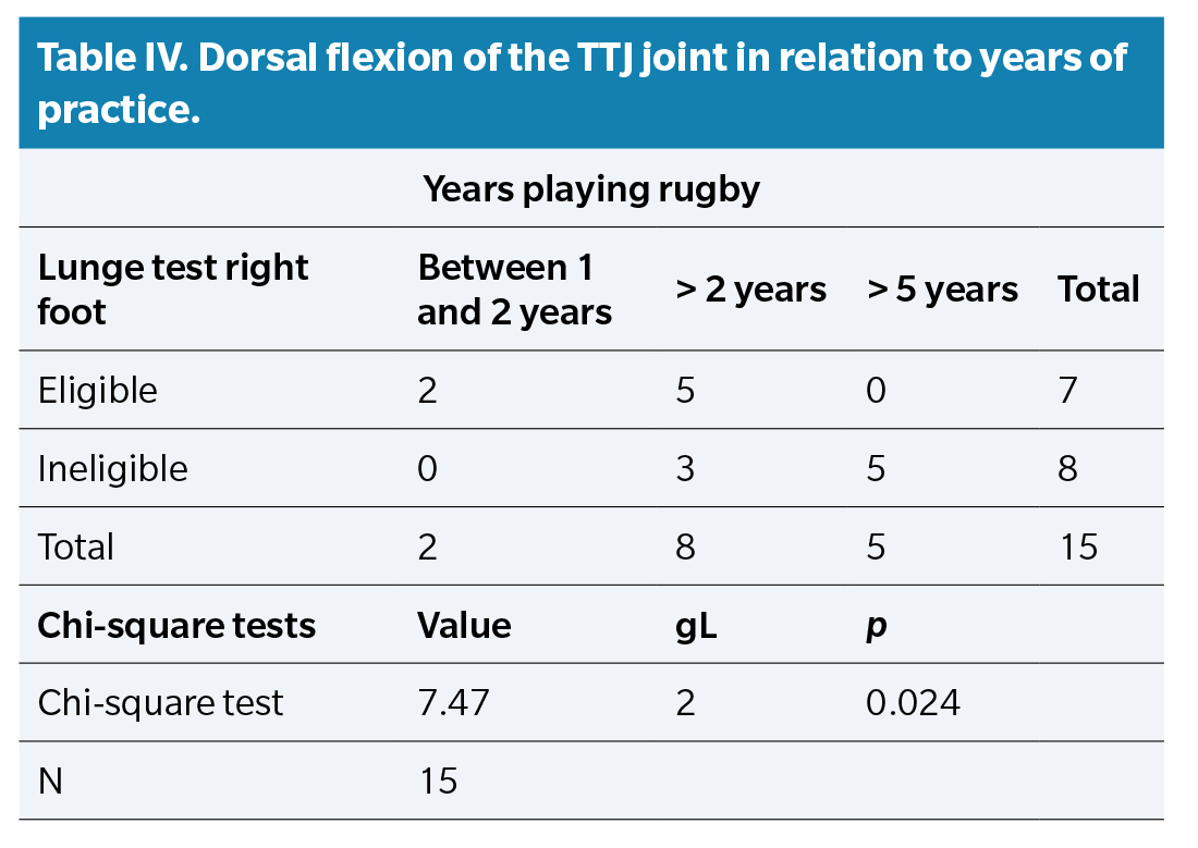 Regarding the functional status of the tibiofibular-talar joint through the Lunge test, a statistically significant association of the right lower limb with gender was found regarding the ability to perform the test adequately (Table 3). On the other hand, a significant association was found between the ability to perform the Lunge test in the right lower limb concerning the years of practice (Table 4).