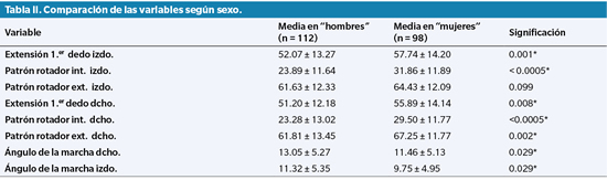 La Tabla II resume los resultados de nuestro trabajo de investigación, en el que se puede observar cómo hay relación del patrón rotador interno con el hallux limitus. A menor patrón rotador interno más limitado se encuentra el movimiento de extensión del primer dedo; podemos ver que este patrón rotador interno es menor en el grupo de hombres, más predispuestos al hallux limitus. Igualmente se establece la relación entre patrón rotador interno y ángulo de la marcha, de modo que a medida que aumenta la capacidad rotadora interna disminuye el ángulo de la marcha. Lo que no discriminamos en este estudio fue que parte del patrón rotador es debido a torsiones femorales o tibiales; no era motivo para el estudio, ya que en realidad pretendíamos estudiar más la resultante de todos los parámetros torsionales incluido el antepié adductus o abductus.