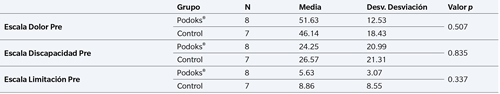En cuanto a la diferenciación de grupos (Podoks® y Control) en las subescalas de Foot Function Index (FFI) previo, en la escala de dolor previo hemos obtenido en el grupo Podoks® una media de 51.63 ± 12.53, y en el grupo Control una media de 46.14 ± 18.43, no obteniendo diferencia significativa en los resultados de ambos grupos (p = 0.507, Tabla 6). Tampoco se encontraron diferencias significativas en las subescalas discapacidad (p = 0.835) o limitación (p = 0.337) previas.