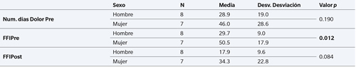 Valorando el FFI previo, las mujeres presentaron una mayor puntuación (50.5 ± 17.9) que los hombres (29.7 ± 9.0), siendo estos resultados estadísticamente significativos (p = 0.012) (Tabla 8). En cambio, los resultados obtenidos no han sido significativos respecto al número de días de dolor previo (p = 0.190) y el FFI posterior (p = 0.084) según el sexo.