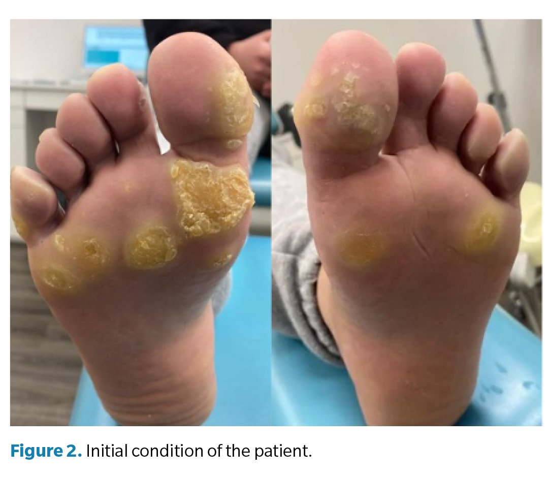 A 24-year-old man presented to the clinic with no relevant past medical history. He exhibited hyperkeratotic lesions on the metatarsal area and the fingertips, most prominently on the first and second metatarsal heads of the right foot and the fourth metatarsal head of the left foot (Figure 2).
