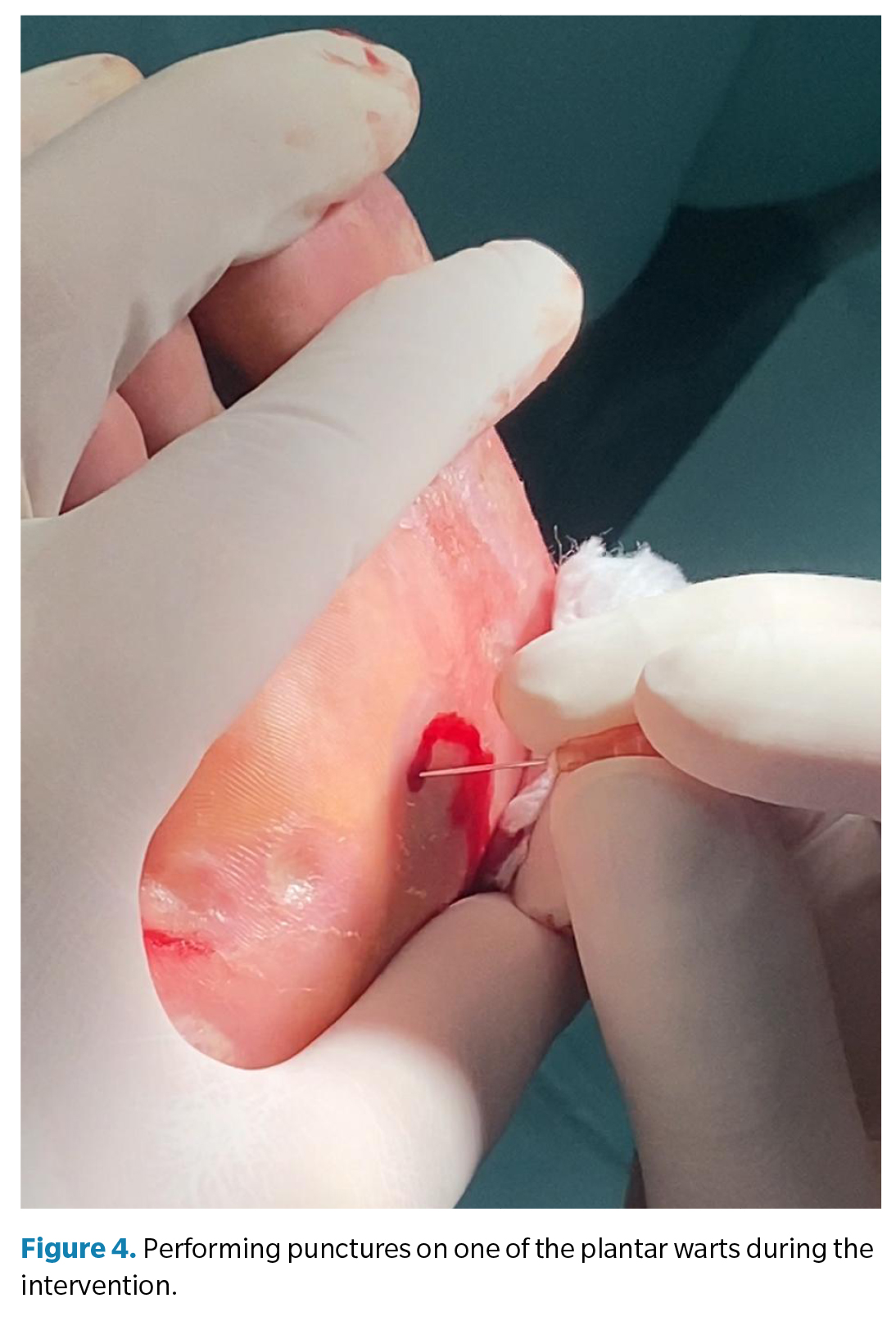 Debridement of the hyperkeratosis was performed with a scalpel before the multipuncture technique. Then, using a 25 G ? needle, punctures were made across the surface of the wart (Figure 4). By targeting the papilloma through the immune system, treatment was applied only to the right foot, as a positive response to the therapy could lead to spontaneous resolution of the contralateral foot. This foot was chosen because it was the most affected one, with a higher likelihood of addressing the primary lesion.