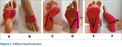Se realiza técnica de liberación de espacio mediante un 8 sobre la planta del pie. La tira de VNM debe ser la mitad de una tira normal (2,5 cm) y se debe empezar desde el lateral del quinto metatarsiano, rodeando el talón y volviendo a la zona lateral del quinto metatarsiano (donde se aplica ligera tensión de 25-30 %) (7C), formando una X en la planta. Se repite el paso anterior, pero empezando por el primer metatarsiano y acabando en el primer metatarsiano (7D). Este paso en muchas ocasiones se obvia y se hace más énfasis en el siguiente paso, que se explica a continuación. Se colocan 3 tiras activas desde el centro del talón (cuarto cuadrante supero-interno) donde se encuentra la inserción de la fascia hacia el origen a nivel de los metatarsianos formando un abanico (7E). La tensión es del 60 %, con el objetivo de corregir y liberar. El pie y dedos se colocan en flexión dorsal durante su aplicación.