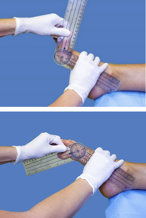 La rotación pasiva interna y externa de la cadera se midió en decúbito prono con una genuflexión de 90° mediante un inclinómetro analógico colocado en el margen tibial (23). Se indicó al paciente que no elevara la cadera opuesta durante la rotación de la cadera ni durante el movimiento de relajación de la pierna hacia ambos lados. La TT se evaluó mediante un goniómetro universal de dos ramas; una de las ramas se colocó en la planta del pie, trazando la bisectriz desde el centro del talón hasta el segundo radio, y la otra rama se dirigió al centro sagital del muslo, manteniendo la posición de la articulación subastragalina neutra(24). En la 1.ª MTPJ, la flexión y extensión pasivas se valoraron colocando el goniómetro en la cara interna del pie, con una rama del goniómetro siguiendo la bisectriz previamente trazada del primer radio y la falange proximal, tras lo cual se forzó el movimiento correspondiente hasta su tope articular(25) (Figura 1).