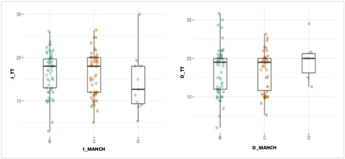 En cuanto a la movilidad de la 1.ª MTPJ, la diferencia encontrada en flexión fue de 1.50° (intervalo de confianza del 95 %: 0.33-3.33, p < 0.016), en extensión fue de 4.66° (intervalo de confianza del 95 %: 3.16-6.15, p < 0.001), y el ROM fue de 6.30° (intervalo de confianza del 95 %: 4.44-8.15, p < 0.001), además, todos los valores fueron superiores en la 1.ª MTF izquierda (Tabla 2). La presencia de HV en la muestra de 129 sujetos se observó bilateralmente en 123 casos (95.34 %) y unilateralmente en 6 casos (4.65 %); con 1 (0.77 %) en el pie derecho y 5 (3.87 %) en el pie izquierdo. En el nivel de gravedad del HV, el estadio B fue mayor en 8 casos (8.06 %) en los pies derechos, según la escala de Manchester(26). Además, los pies izquierdos presentaron un aumento de 7 casos (4.85 %) más de HV en el estadio C, y 5 casos (3.82 %) más en el estadio D, pero no se observaron diferencias estadísticamente significativas entre ambos pies (Odds Ratio (OR) B: 0.86, p = 0.420; OR C: 1.33, p = 0.266; y OR D: 2.11, p = 0.163). Tanto para el estadio de Manchester en el pie izquierdo como en el derecho, no se encontró ningún efecto significativo con la rotación de la cadera, TT (Figura 4), FPI (Figura 5) o APP (Figura 6) (p > 0.05). En la Tabla 2 se describen los valores de las variables según el grado de severidad del HV .