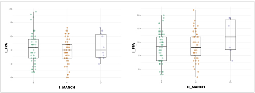 Figura 3. Diferencia de lado del ángulo de progresión del pie (Foot posture angle: FPA) por lado. D: derecho. I: izquierdo.