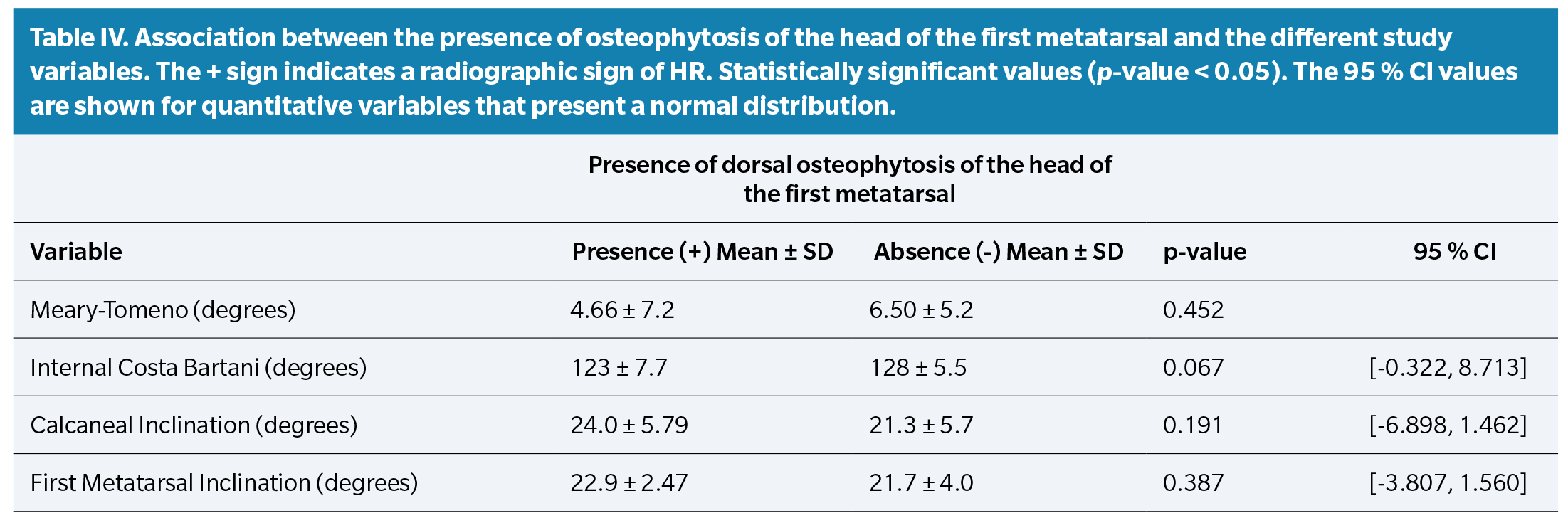 In conclusión, the results of the present study have shown that goniometric measures that represent values consistent with flattening of the MLA are associated with signs of joint degeneration of the 1MTPJ, with the Meary-Tomeno angle showing the best association with the clinical-radiographic diagnosis of HR, suggesting a possible association between HR and tarsal pronation or flatfoot.