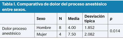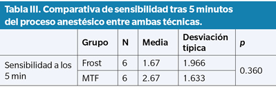 La media del dolor expresado en la realización del proceso por el total de los participantes fue de 5.17 ± 2.517. En cuanto a los sexos, la media de dolor que fue expresado mostró diferencias entre ambos grupos, siendo la media entre los hombres de 4.00 ± 1.852, y en las mujeres de 7.50 ± 2.082 (p = 0.014). Esto reveló que los hombres manifestaron menos dolor ante la realización del proceso anestésico (Tabla I). Cuando se comparó el dolor del proceso anestésico entre ambos grupos (p = 0.668) (Tabla II); la sensibilidad tras 5 min del proceso anestésico entre ambos grupos (p = 0.360) (Tabla III); y la anestesia a los 10 min del proceso anestésico entre ambos grupos (p = 0.372) (Tabla IV).