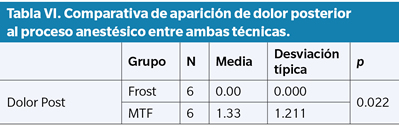 • Dolor postanestésico: La media de dolor postanestésico entre el total de los participantes fue de 0.67 ± 1.073. En cuanto a la comparativa de la media de dolor postanestésico entre ambas técnicas, resultó que la técnica “H de Frost” no reportó ningún caso de dolor postanestésico en el estudio, mientras que en la técnica metatarsal (1.33 ± 1.211) se dieron casos de dolor posterior a la realización del bloqueo, por lo que ambas técnicas presentaron diferencias significativas en cuanto a la presencia de dolor posterior (p = 0.022) (Tabla VI).