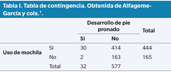 La Tabla I recoge los datos de un estudio de Alfageme-García y cols.1, publicado en 2020, sobre si el uso de mochilas podría ser un factor de riesgo para el desarrollo de un pie pronado durante la edad infantil. Hicieron un estudio prospectivo durante 3 años en los que estudiaron la aparición de pies pronados en niños que habitualmente usan mochilas y niños que habitualmente no las usan. El odds radio lo calculamos dividiendo el odds de desarrollar pie pronado en niños que usan mochila (30/414 = 0.072) entre el odds de desarrollar pie pronado en niños que no usan mochila (2/163 = 0.0122), es decir, 0.072/0.0122 = 5.9. Estos resultados del odds ratio indican que existe una asociación positiva entre el uso de mochila en edad infantil y el desarrollo de pie pronado. El IC al 95 % para dicho odds ratio va desde 1.39 a 24.99. Es decir, es un resultado estadísticamente significativo para una prueba de contraste de hipótesis al 5 % (valor p menor de 0.05), ya que el intervalo de confianza no cruza el valor de 1.0.