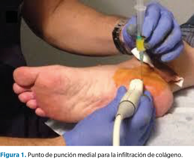 • Grupo A (experimental): infiltración ecoguiada de colágeno. Se aplicó una infiltración de colágeno semanalmente, durante cuatro semanas consecutivas, aplicando un total de cuatro infiltraciones en ambos pies. Todos estos pacientes recibieron la dosis de 1 ml de colágeno en cada pie; las infiltraciones se realizaron hasta completar las cuatro dosis, aunque el paciente refiriera que no tenía dolor tras la primera infiltración (Figura 1).