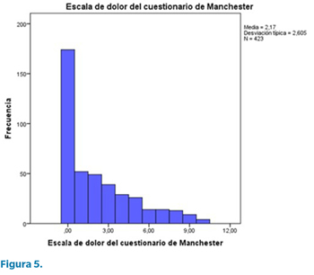 En el cuestionario de Manchester se analizaron la dimensión Función y dimensión Dolor. Los datos obtenidos al puntuar las respuestas muestran unos valores medios en la dimensión Función de 3.43 ± 4.47 con una mediana de 2 y en un rango de 0 a 20 puntos. En la dimensión Dolor la media es de 2.17 ± 2.60 con una mediana de 1 en un rango de 0 a 10 puntos. Las Figuras 4 y 5 muestran la distribución de las puntuaciones en las dimensiones Función y Dolor, evidenciándose que no siguen una distribución normal y que la puntuación más frecuente se encuentra en ambas dimensiones en valores inferiores a la media.