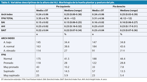 Los valores de las variables descriptivas de la altura del ALI (Tabla II) muestran que las morfologías de huella plantar más frecuentes según AI eran la huella normal, 38.6 % en pie izquierdo y 43.6 % en pie derecho seguida por huella de arco bajo 34.4 % en pie izquierdo y 34.8 % en pie derecho. Las posturas, según valores de FPI-6, más habituales eran la neutra, en pie izquierdo 41.5 % y en pie derecho 44.4 %, seguida de la posición pronada (valores de +6 a +9), 28 % en pie izquierdo y 28,8 % en pie derecho.