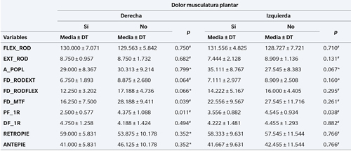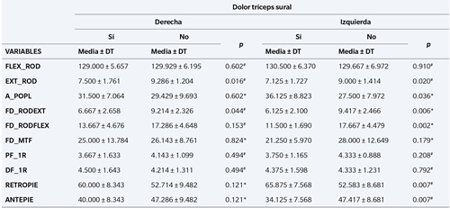 Tabla II. Comparación entre el dolor en el tríceps sural y las variables estudiadas.