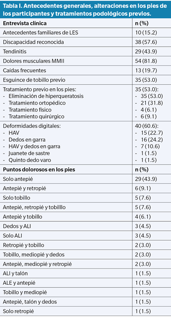 En el estudio participaron 66 pacientes con LES (65 mujeres y 1 hombre) con una edad media de 47.27 ± 11.89 años, un índice de masa corporal medio de 27.88 ± 6.21. La evolución de la enfermedad en los participantes del estudio fue de 15.76 ± 10.19 años (mínimo 1 año, máximo 38 años). Los datos sobre antecedentes familiares de la enfermedad, alteraciones podológicas referidas por los pacientes y/o constatadas por el equipo investigador, y los tratamientos en los pies recibidos con anterioridad se muestran en la Tabla I. Como se ha podido observar en la Tabla I, el 100 % de los pacientes presentaban algún punto doloroso en los pies.