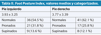 Los valores medios del FPI obtenidos para ambos pies, así como la categorización en neutros, pronados y supinados, se muestra en la Tabla II. Como se puede observar, la mayoría de los pies explorados estarían dentro de la categoría de pies neutros. La categorización de las huellas plantares obtenidas de 65 participantes (1 valor perdido) se presenta en la Tabla III. El grupo de huellas predominante fue el de las huellas con arco normal, seguido de las de arco elevado.