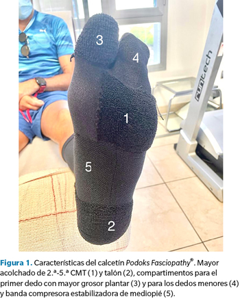 Conclusiones: Los calcetines biomecánicos Podoks Fasciopathy® reducen en un 25 % las presiones plantares dinámicas bajo la cabeza del primer metatarsiano y en un 23 % el primer dedo comparando con el propio calcetín. Esto podría tener un potencial efecto beneficioso en la activación del mecanismo de Windlass, y por tanto ayudar en el tratamiento de patologías podológicas.
