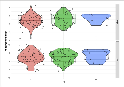 The present study performed a comparison of HV severity stages and analyzed the range of rotation of the hip joint, TT, first metatarsophalangeal joint (1st MTPJ), foot posture index (FPI), and foot progression angle (FPA) individually and together in patients with HV. The aim was to identify laterality differences in the lower limbs and their possible relationship with the degree of HV severity.
