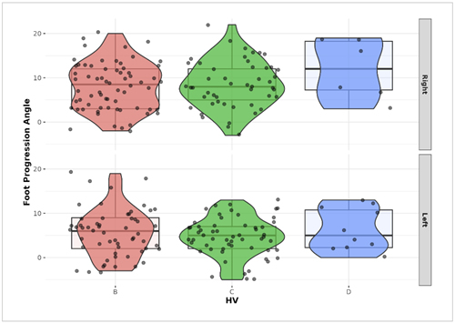 Figure 6. Relationship between Hallux valgus (HV) and Foot progression angle (FPA).