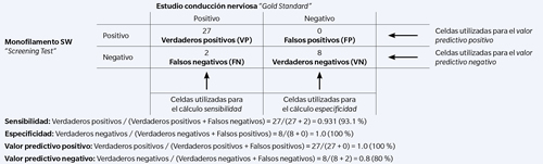 La Tabla 1 presenta una tabla de 2 × 2 que compara los resultados del test de monofilamento con respecto al estudio de conducción nerviosa en el estudio de Lee y cols. Cada caso es asignado a uno de los cuatro recuadros de la tabla 2 × 2 según haya sido su resultado en ambos test. De esta forma se agrupan los casos en 4 grupos que son: a) verdaderos positivos: el paciente tiene neuropatía y el test monofilamento es positivo; b) falsos positivos: el paciente no tiene neuropatía y el test monofilamento es positivo; c): falsos negativos: el paciente tiene neuropatía y el test de monofilamento es negativo y d) verdaderos negativos: el paciente no tiene neuropatía y el test de monofilamento es negativo. Los valores de sensibilidad, especificidad y valores predictivos se calculan con los casos de las celdas tal y como muestra la Tabla 1.