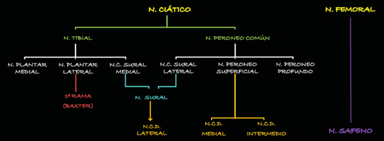 Figura 1. Esquema de los nervios del pie. N.: nervio. N.C.: nervio cutáneo. N.C.D.: nervio cutáneo dorsal.