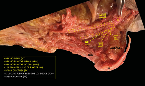 La primera rama del nervio plantar lateral o rama de Baxter se escinde del nervio plantar lateral previamente a su introducción en la cara plantar, para continuar atravesando el talón en dirección al músculo abductor del quinto dedo3. La rama de Baxter y el nervio plantar lateral comparten el mismo origen en el 80 % de los casos, y el 34.5 % se bifurcaron proximal a la línea de Dellon-MacKinnon, el 31.2 % distalmente y el 34.3 % al mismo nivel de la citada línea9.