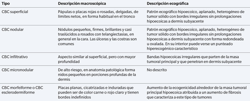 Existen distintos tipos de carcinoma basocelular, con diferentes características tanto clínicas como ecográficas, existiendo múltiples variaciones en la bibliografía respecto a su clasificación (6,10,11,12,13,14) (Tabla 1).