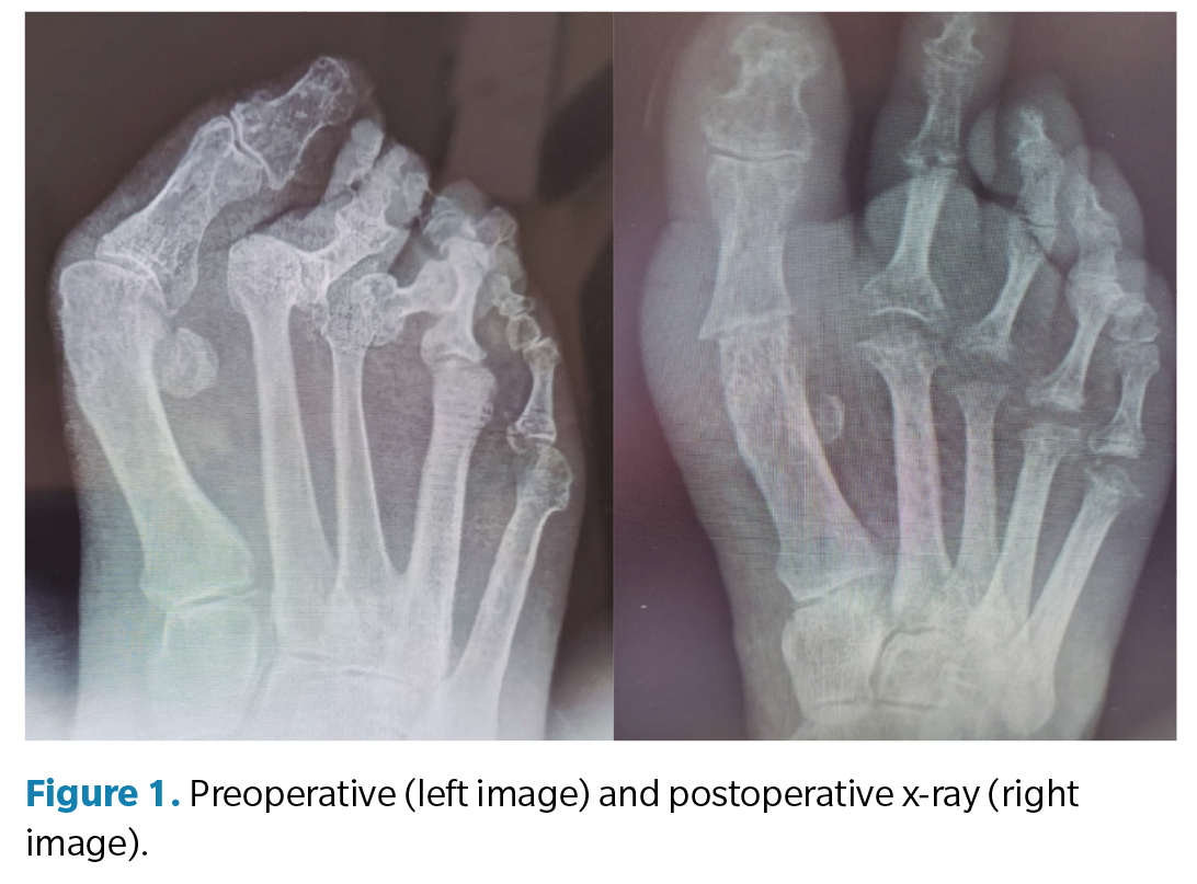 Introduction: Rheumatoid arthritis is an autoimmune, inflammatory, chronic and progressive disease that affects the musculoskeletal system and can cause deformity, pain and decreased function of the foot, being able to observe the presence of a triangular forefoot and claw toes with decreased of mobility and pain. Its treatment can be conservative and/or surgical.