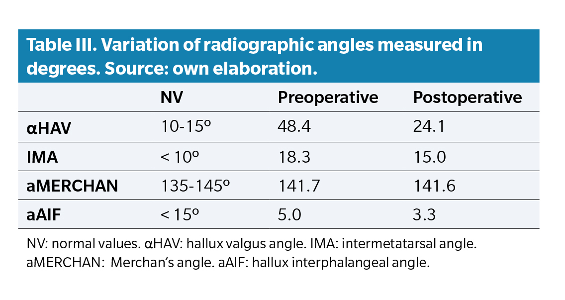 Regarding preoperative radiological angles, a mean of 18.3º was observed for the intermetatarsal I-II angle (IMA I-II) and 48.4º for the hallux abductus valgus angle (αHAV). After the intervention, the mean IMA I-II was 15º and the αHAV was 24.1º. Regarding the Merchan’s angle, mean preoperative and postoperative values of 141.7 and 141.6, respectively, were observed. In the case of the interphalangeal angle, mean preoperative and postoperative values of 5º and 3.3º, respectively, were seen (Table 3).