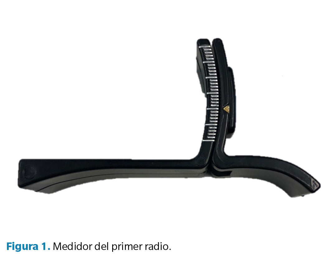 Las mediciones del primer radio se cuantificaron con el Medidor de Primer Radio® (Fresco Podología SL, Barcelona, España), instrumento válido y fiable que ha sido utilizado previamente en otros estudios (Figura 1) (7,8,13). Para esta medición, una mano se mantuvo la rama horizontal sobre las cabezas del 2º, 3º, 4º y 5º metatarsiano y la otra mano sujetó la rama horizontal de la otra parte contra la cabeza del primer metatarsiano. Partiendo de esta posición, se movió hacia arriba la cabeza del primer metatarsiano junto con la rama horizontal para comprobar cuántos milímetros de DF marca en la rama vertical y lo mismo hacia abajo para calcular la PF (Figura 2, Figura 3, Figura 4) (7,8). Esta medición se hizo 3 veces en cada pie para usar la media de ellas en el análisis estadístico.