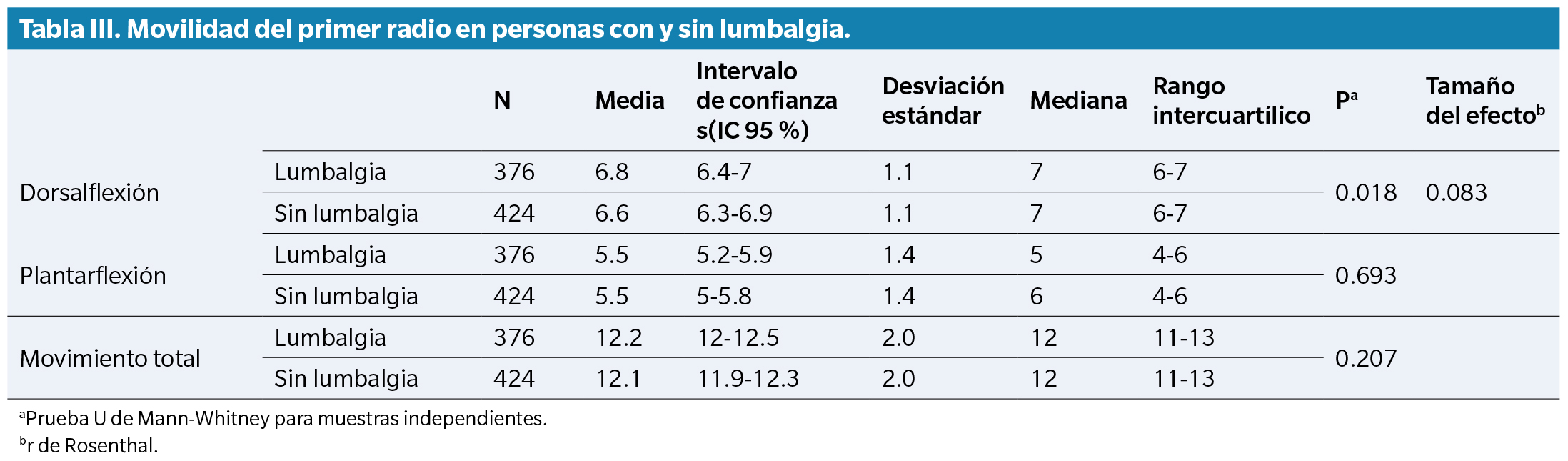 Sin embargo, una vez que se aplicó el filtro de contabilizar solo a las personas sin lumbalgia que tuvieran pies normales, y comparar la movilidad del primer radio con las personas con lumbalgia y pies con movilidad alterada, se pudo observar que la PF fue la variable que presentó el tamaño del efecto más elevado, aunque sin llegar a ser grande. Esta variable fue menor en los casos de lumbalgia (Tabla 4). Es decir, aunque las diferencias fueron estadísticamente significativas, clínicamente deben ser interpretadas con cautela.