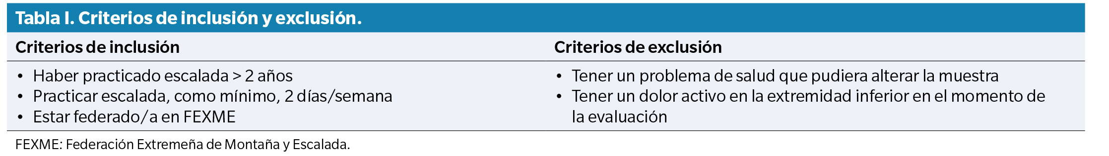 Se realizó un estudio descriptivo, transversal y prospectivo (febrero-noviembre de 2021) con escaladores usuarios habituales del rocódromo CerezaWall (Plasencia) y que pertenecían a la FEXME (Federación Extremeña de Montaña y Escalada).