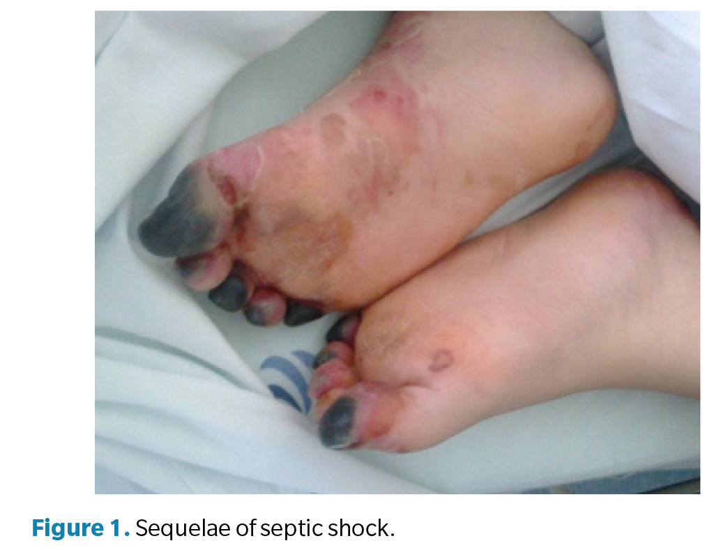 Septic shock is a severe clinical entity characterized by systemic tissue hypoperfusion, organ dysfunction, and cellular death secondary to a dysregulated host response to infection(1,2). Among its clinical forms, fulminant meningococcal sepsis represents one of the most devastating presentations, as it can rapidly progress to multiorgan failure and purpura fulminans with severe peripheral vascular compromise(3,4). This microvascular involvement can lead to ischemia and distal necrosis, resulting in digital or even complete limb amputations, with major anatomic and functional consequences in young, previously healthy patients. Thromboembolic complications observed in meningococcal shock are related to the direct toxic effects of Neisseria meningitidis on tissues, disseminated intravascular coagulation, and the release of vasoactive cytokines that alter microcirculation5. Although rare, tissue necrosis associated with this condition mainly affects the lower limbs and usually manifests as multifocal ischemic lesions that progressively coalesce(5,6).
