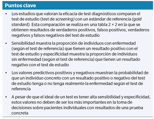 Muchas de las pruebas diagnósticas presentan sus resultados de forma dicotómica (ej: Sí/No; Enfermo/No enfermo). Idealmente, estas pruebas deberían ser capaces de identificar todos los pacientes que tienen una enfermedad o condición, e igualmente identificar todos los pacientes que no la tienen. Es decir, el test perfecto nunca es positivo en un paciente no enfermo y nunca es negativo en un paciente enfermo. Sin embargo, la realidad dista mucho de este concepto ideal y todos los test presentan errores. La forma que tenemos de valorar la validez de un test diagnóstico es mediante estudios que comparan dicha prueba diagnóstica con lo que se conoce como prueba gold standard o prueba estándar de referencia que establece como “verdadero” el estado de la enfermedad o de la condición del paciente. Estos estudios valoran la efectividad por medio de los conceptos de sensibilidad, especificidad, valor predictivo positivo y valor predictivo negativo.