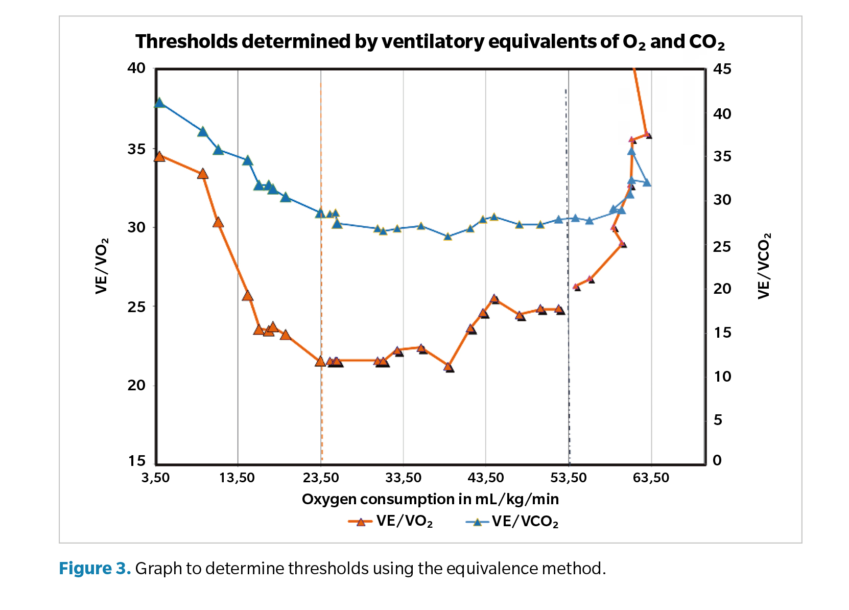 Ventilatory equivalents for O2 and CO2: the ventilatory equivalent for O2 is the VE/VO2 and CO2 ratio. As shown in Figure 3, plotting all values from the gas analyzer reveals that the VE/VCO2 ratio initially decreases (corresponding to Vt1), then stabilizes, and finally rises (corresponding to Vt2). The behavior of VE/VO2 similarly starts with a significant decrease (corresponding to Vt1), stabilizes, and then sharply increases (corresponding to Vt2).