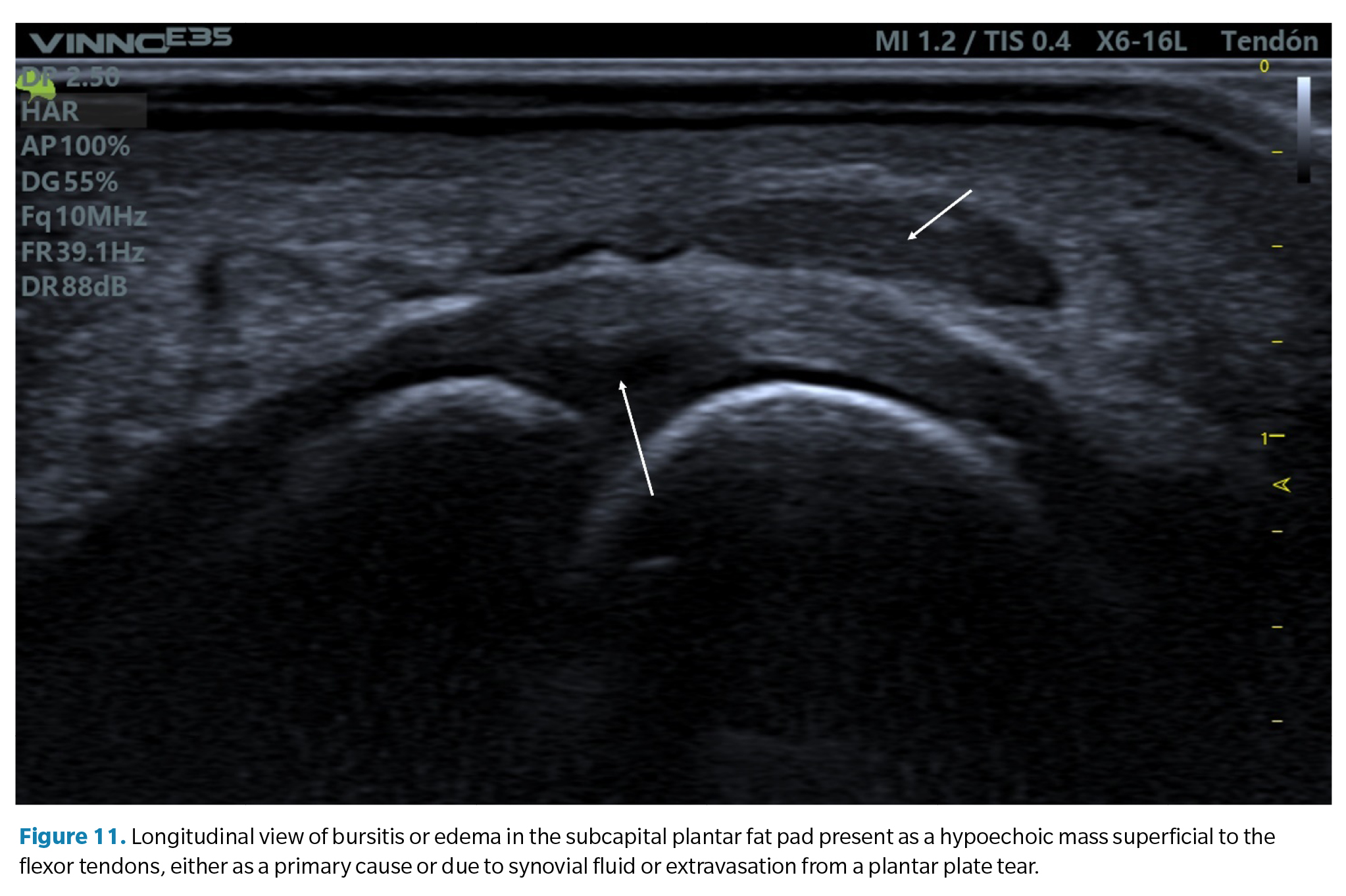 2. Bursitis of the plantar fat pad. In relation to the previous finding, some cases of plantar plate tears may also be accompanied by a hypoechoic infiltrate in the adjacent plantar fat pad. This may be a primary defect due to excessive compression of the fat (compression which is also part of the compressive injury etiology of the plate) or the result of a synovial fluid infiltrate due to capsular rupture extravasation as previously mentioned. It is common in these cases to detect a positive <