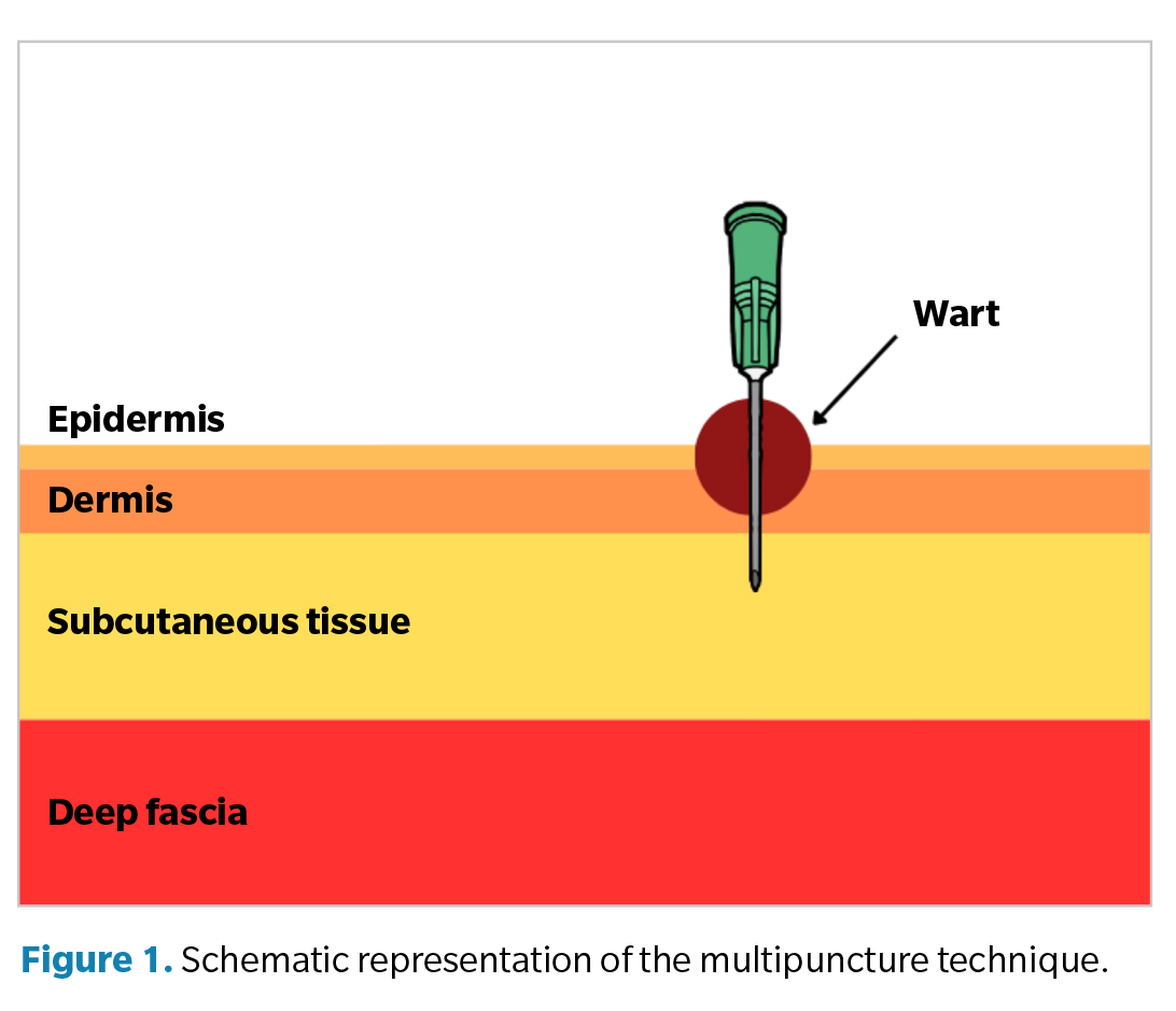 There are multiple therapeutic options: chemical treatments (nitric acid, salicylic acid, cantharidin...), physical treatments (liquid nitrogen, laser...), pharmacological approaches (bleomycin), and surgical options(4). Falknor’s multipuncture technique, or the “needling method,” is an alternative to conventional surgical treatment first described by Gordon W. Falknor in 1969. This technique involves puncturing the plantar wart (Figure 1), inducing a controlled inflammatory process that allows the immune system to identify viral proteins and generate antibodies to eliminate the virus-infected cells(2,5,6,7,8,9).