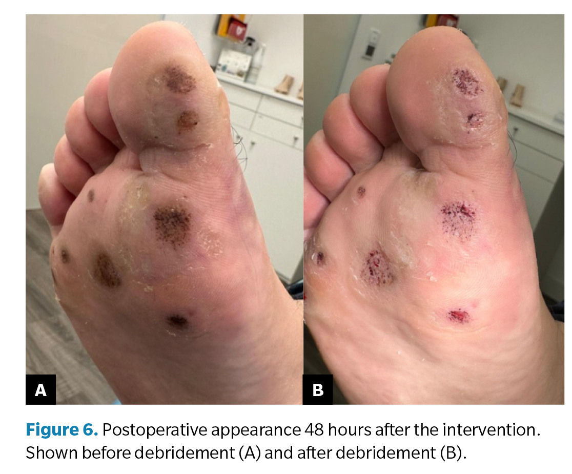 A change in the appearance of the lesions is noted, with the wounds appearing much drier vs 48 hours post-treatment. At this stage, the lesions can be debrided without any issues. Hyperkeratosis was removed with a scalpel (including from the untreated contralateral foot, which showed apparent improvement, as seen in Figures 7 and 8).