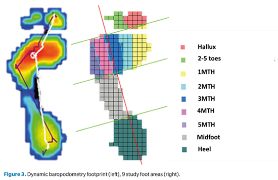 At Session 1 and Session 2, before and after weight loss intervention, participants were subjected to a baropodometric examination (static and dynamic). It allowed to quantitatively mapping pressures in each segment of the plantar surface20,21. For the static, participants were asked to stand in the center of the platform for 5 seconds, with their arms on either side of the body in a natural position looking straight ahead22. To minimize individual´s corporal fluctuations in static (as body weight oscillation and imbalance) we applied this procedure 3 times per session22. For the dynamic, participants were asked to walk barefoot on the platform at their normal pace following the 3-step protocol, which requires landing on the platform on the third step of gait23. To minimize individual’s corporal fluctuations in dynamic (as body weight oscillation, imbalance and changes in gait speed) we applied this procedure 3 times per session22. Both feet were subdivided into 9 areas: heel, midfoot, 5 MTHs, the Hallux, 2-5 toes (Figure 2). Selection of the areas of the present study is justified because it is based on the daily clinic, where the consultations of overweight patients are usually due to discomfort or pain in metatarsal heads (MTH), reason why these are studied separately and is supported by authors like Hills et al.11, who performed a complete study of the differences of pressures between obese and non-obese subjects.