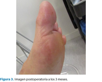 Se realizaron curas postoperatorias a los 7 y 14 días. Las curas se realizaron de forma satisfactoria y se retiraron los puntos a los 14 días sin complicaciones de infección o dehiscencia de la herida quirúrgica. A las 3 semanas de la intervención la paciente recibió el alta. Tres meses después se realizó otra revisión, en la cual la paciente se mostró muy satisfecha con los resultados. No se observaron signos de recidiva, ni presentó dolor ni cicatriz hipertrófica (Figura 3).