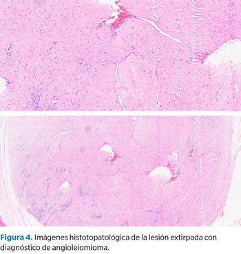 Los hallazgos histopatológicos característicos incluyen haces concéntricos de músculos lisos que se cruzan e irradian las paredes de los vasos sanguíneos y son determinantes para el diagnóstico de angioleiomioma. Un nódulo subcutáneo firme y solitario de la extremidad inferior con diferenciación obvia del músculo liso en secciones teñidas con hematoxilina-eosina confirmada por tinción roja en una tinción tricorme de Masson e inmunohistoquímica con anticuerpos contra el músculo liso, es diagnóstico de leiomioma vascular9 .