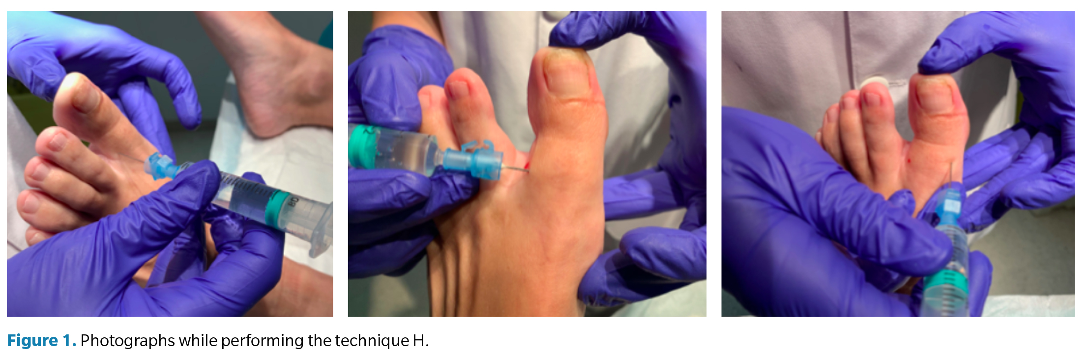 Choosing the appropriate anesthetic technique depends on the patient’s needs, surgery duration, and surgeon’s preference. Incorrect application of these techniques may cause intense pain and stress for both the patient and surgeon(14). Currently, the ring block technique is the most widely known(15,16). This involves 2 injections at the base of the toe (Technique H). In contrast, Technique V, which involves a single dorsal injection at the base of the first toe(7,16,17), may offer significant advantages.