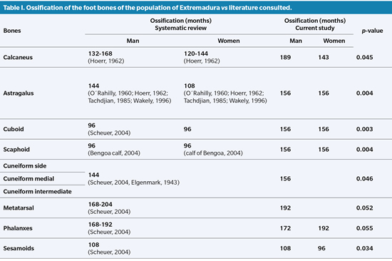 In Table I we can see the total ossification of the bones that comprise the foot, comparing the Extremaduran population against what the consulted literature dictates.