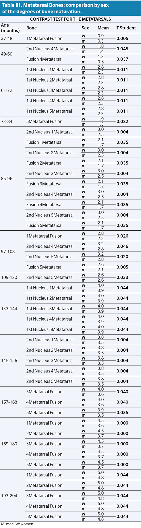 All the bones that make up the Tarsus have statistical significance in the comparison by sex with the exception of the Cuboid, the medial Cuneiform and the lateral Cuneiform. The rest of the tarsus bones have an explicit difference (P value ≤0.05) that translates into a discrepancy between the degree of ossification and its speed, later and slower for males (Table II).